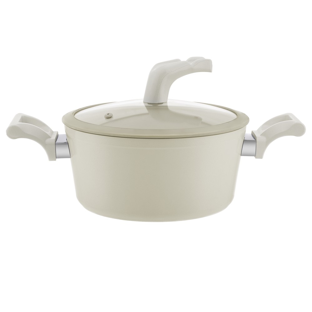 Discover cooking perfection with the Vega pot, an ideal choice for your modern kitchen. This elegant and functional pot transforms everyday cooking into a pleasant and effortless experience. With a 5.5-liter capacity and balanced dimensions (26 cm diameter x 12 cm height), the Vega pot is perfect for a wide range of dishes, from simmering soups and sauces to preparing pasta or meat dishes. Its creamy color and clean design add a touch of elegance and modernity to any kitchen. At the core of this pot lies its innovative ceramic non-stick coating. This exceptional surface guarantees your food won't stick, making cooking and cleaning incredibly easy. It's also safe and free of harmful chemicals, allowing you to cook healthier meals with less fat. Constructed from durable aluminum, the Vega pot ensures uniform and rapid heat distribution across the entire surface, preventing hot spots and ensuring even cooking every time. The transparent glass lid is a practical feature, allowing you to monitor your food without removing the lid, which preserves heat and moisture. Furthermore, its induction-compatible base makes it suitable for all types of cooktops, increasing energy efficiency and heating speed.