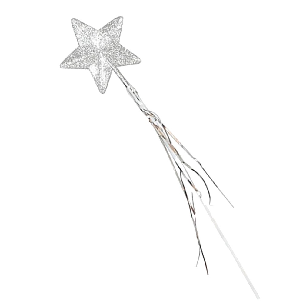 Plastic stick with white handle and shiny silver star, with angel thread. The size of the star is 10.5x45 cm, in length of 45 cm. suitable for use by children at parties.