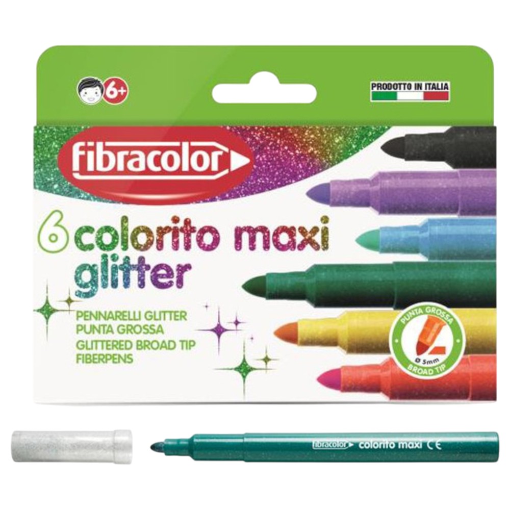 This set contains 6 markers in brilliant colors and glitter effect, with Maxi tip (5 mm) for thick drawings and visible effect. These markers are ideal for decorations, cards, visual projects and creative activities for children and adults.