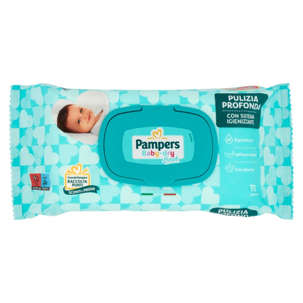 Pampers fresh baby wipes. Made from extra consistent soft fabric with a soft wavy texture, the wipes are particularly soft and gentle on the skin and are equipped with a special formula capable of restoring the skin's natural pH, protecting it from irritation . Ideal to ensure maximum hygiene for your baby in all situations, they do not contain alcohol or soap, therefore they are ideal for cleaning the face, hands and diaper area.