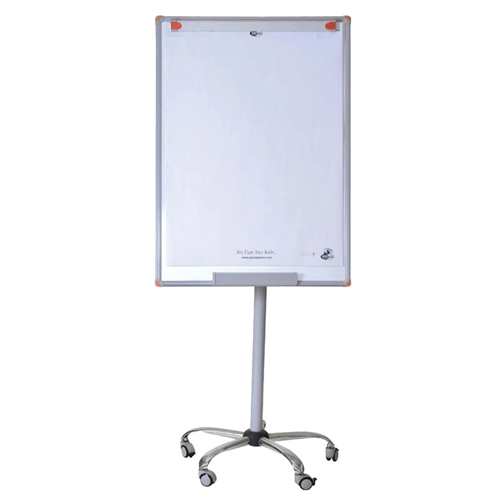 White board, size 70x100 cm, with a supporting structure with five-wheel legs. It is used in offices, schools, etc., to keep notes on paper, which is placed on it by means of a fixing mechanism. This product is suitable for use in meeting rooms, training rooms, etc.