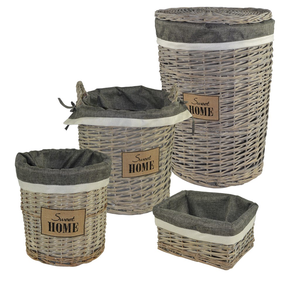 Whether as a decorative piece or as a part of your storage and organization system, this fun basket set is sure to become a favorite part of your home decor. This willow hand made basket set inspired finish can be used in laundry, bedrooms or living rooms adding style and functionality. The set consist of: 1-Dia.40xH56 cm; 1-Dia.33xH32 cm; 1-Dia.26xH27 cm; 1-24x18xH12 cm