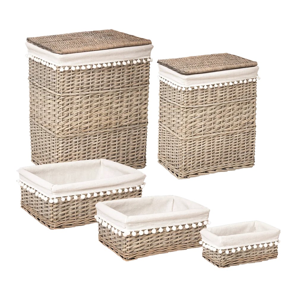 You're reviewing:Wicker box set of 5 pieces, willow and textile, white, 27x17xH11; 33x23xH13 cm; 39x29xH15 cm; 37x26xH48 cm; 44x32xH56 cm
