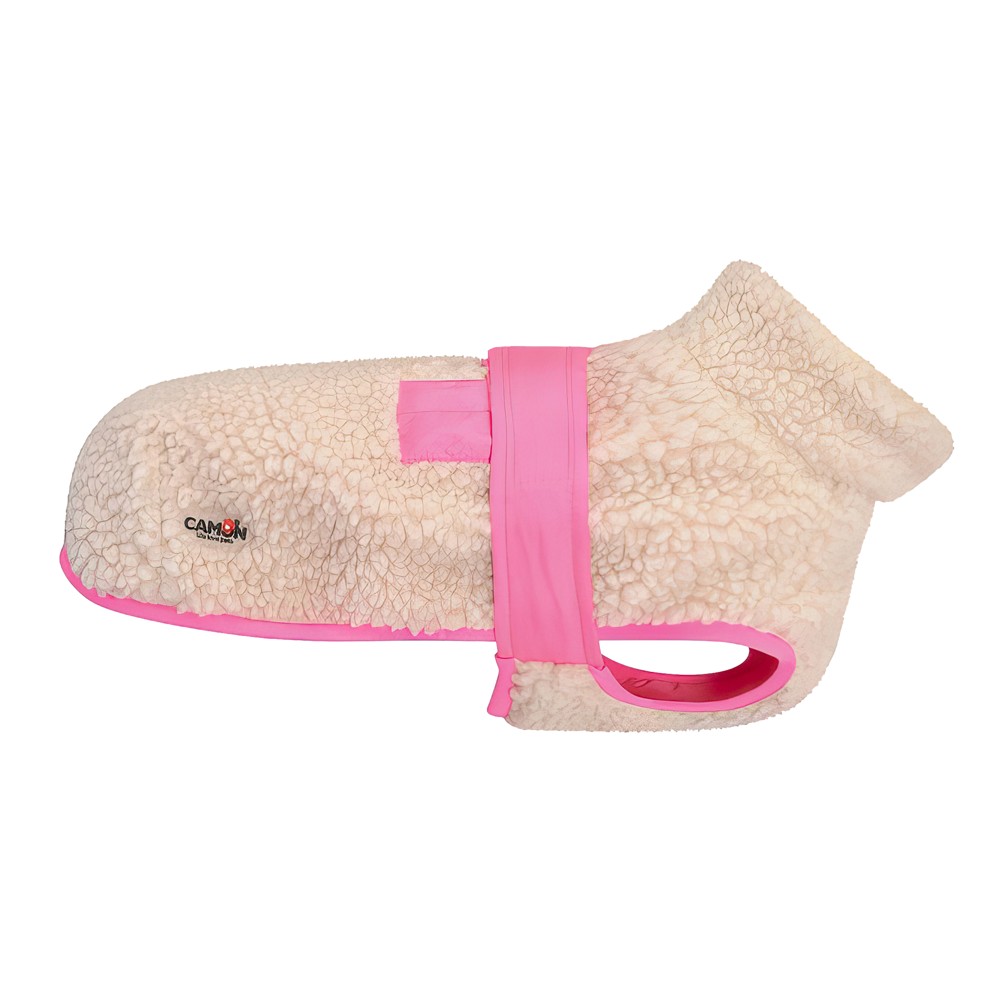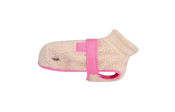 Coat with water resistant lining and faux sheepskin lining. Velcro closure on the back, small contrasting pink pocket and velcro closure adjustment on the neck. Zip opening for the bib and elastic bands for the hind legs.