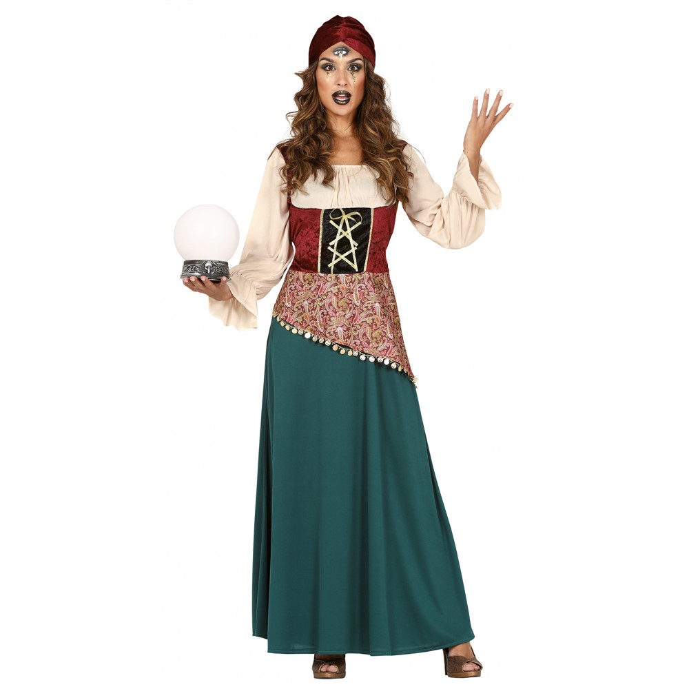 Gypsy themed suit made of polyester material consisting of a long-sleeved dress and a callma of the head in beige and green. Dimensions of S: shoulders 36 cm, bust 94 m, waist 90 cm, length 135 cm. Ideal for use on holidays, birthdays, gypsy themed halloween.