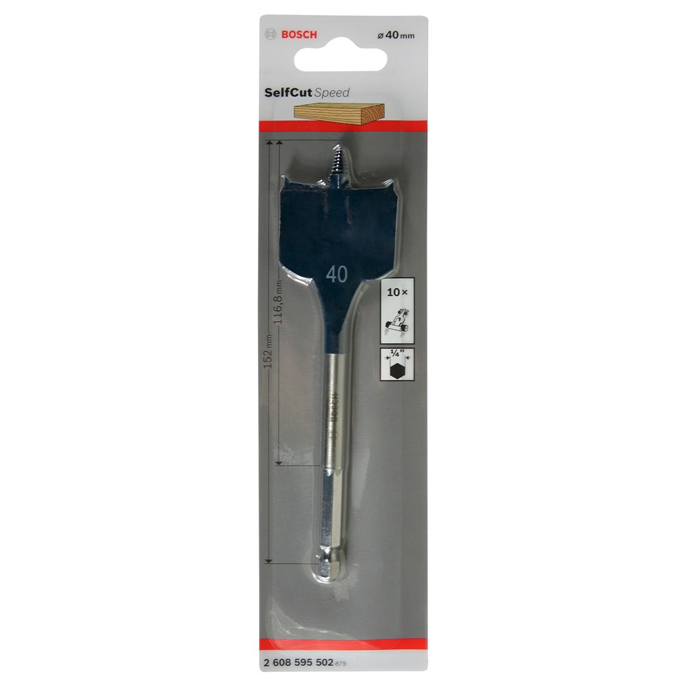 Suitable for soft and hard wood, light building material and plasterboard. Drills three times as fast as standard spade bits. Patent pending, self feeding threaded tip and cutting geometry. Manufactured in accordance with own factory standards from specially toughened steel. Precision ground tip and cutting edges for accurate dimensional stability when drilling. Shank with 1/4" hexagon socket manufactured to DIN 3126 - E 6.3. Innovative self-feeding threaded tip for fast and accurate drilling with little exertion of force