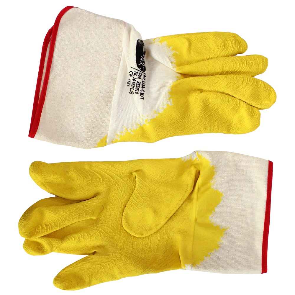Yellow cotton work gloves with rubber coated green color, quite Used in construction and gardening due to the high density rubber enabling maximum protection from strong tools. Very comfortable and cozy thanks to the resilience them.