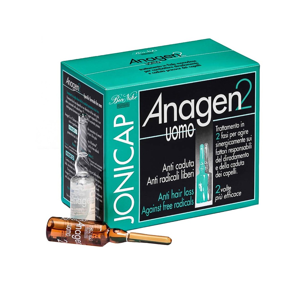 Ampula për trajtimin e simptomave të rënies së flokëve tek meshkujt. Ampula 1: Përmban kompleksin antioksidant BIOSTIMOL që mbron rrënjën e flokut nga radikalet e lira, si dhe sulfat zinku që redukton sekretimin e sebumit i cili në sasi të shtuar dëmton rritjen e flokut. Ampula 2: Lufton rënien e flokut nga shkaqe hormonale, në sajë të ekstraktit të Serenoa repens dhe acidit laurik. Përmban çaj jeshil dhe GAG (glukozaminoglikane) me rëndësi vitale për rrënjën e flokut. Shtimi i vitaminave dhe mineraleve përmirëson metabolizmin e rrënjës dhe qelizave të lëkurës duke ushqyer, hidratuar dhe ristrukturuar boshtin e flokut. Mënyra e përdorimit: Pas larjes së flokëve me shampon Anagen, aplikoni ampulën e parë në flokë të lagur, duke masazhuar skalpin me lëvizje rrethore për disa minuta. Pas 3 ditësh aplikohet ampula e dytë, përsëri pas larjes së flokëve. Trajtimi vazhdohet për dy muaj dhe rekomandohet të përsëritet 2 herë në vit.