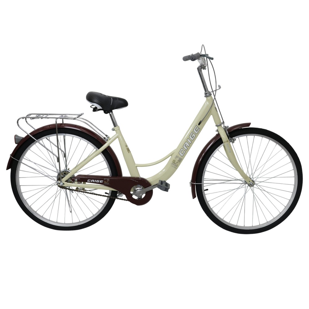 Biçikleta për të rritur Caige 26” është krijuar për të ofruar një përvojë të rehatshme dhe të sigurt në çdo udhëtim, qoftë për përdorim të përditshëm apo për shëtitje në natyrë. Me dizajn elegant në ngjyrë bezhë dhe strukturë të fortë, ajo kombinon funksionalitetin me estetikën. Korniza e qëndrueshme prej çeliku të lehtë siguron stabilitet, ndërsa rrotat 26 inç ofrojnë balancë të shkëlqyer dhe rrëshqitje të butë në rrugë të ndryshme. Biçikleta është e pajisur me sistem frenimi të sigurt, ulësen ergonomike dhe pedale antirrëshqitëse që garantojnë komoditet gjatë vozitjes. E përshtatshme si për meshkuj ashtu edhe për femra, Caige 26” është zgjedhja ideale për ata që kërkojnë cilësi, stil dhe performancë në një biçikletë të vetme.