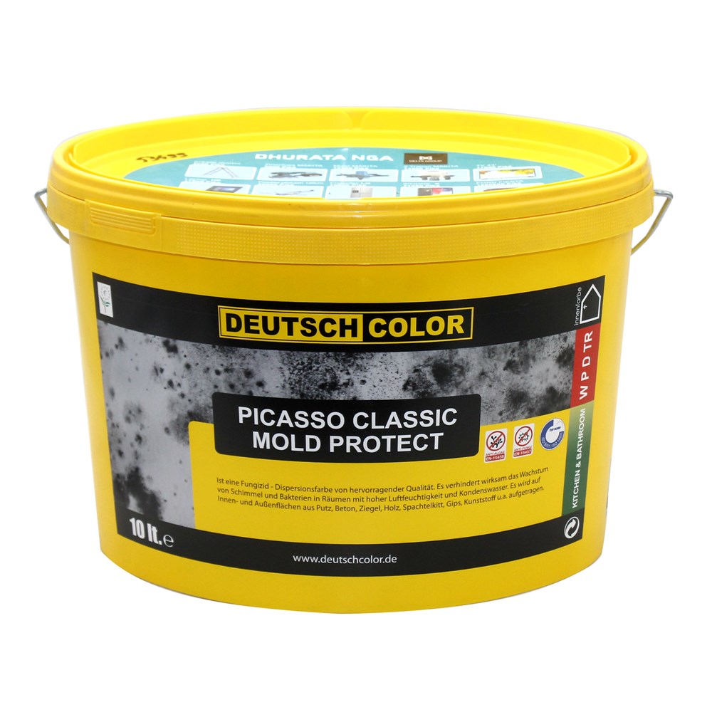PICASSO CLASSIC MOLD PROTECT: bojë emulsioni shkatërruese kërpudhash me cilësi të shkëlqyeshme për përdorim të brendshëm. Ndalon rritjen e mykut dhe baktereve, mbron nga krijim i cipave të thata, mbulueshmëri e shkëlqyer, sipërfaqe e lëmuar mat, punueshmëri dhe nivelim i shkëlqyer, ngjitje shumë e fortë dhe tharje e shpejtë. Mund të përdoret në: sipërfaqet e brendshme të llaçit, betonit, tullës, drurit, llaçit, gipsit, plastikës etj. Zona me lagështi të lartë dhe kondensimin e avujve si kuzhina, banjo, tavane, bodrume. Sipërfaqet duhet të jenë të pastra, të thata dhe të lira nga të gjitha materialet e dëmtuara dhe defektoze, pluhurat, papastërtitë, vajrat dhe kripërat. Rekomandohet që sipërfaqet e lyera të mos lahen deri në 20-30 ditë pas aplikimit. Në sipërfaqe të betonit të freskët produkti rekomandohet të aplikohet të paktën pas 30-40 ditësh. Rekomandohet që të shmanget aplikimi i produktit në temperatura nën 5°C.