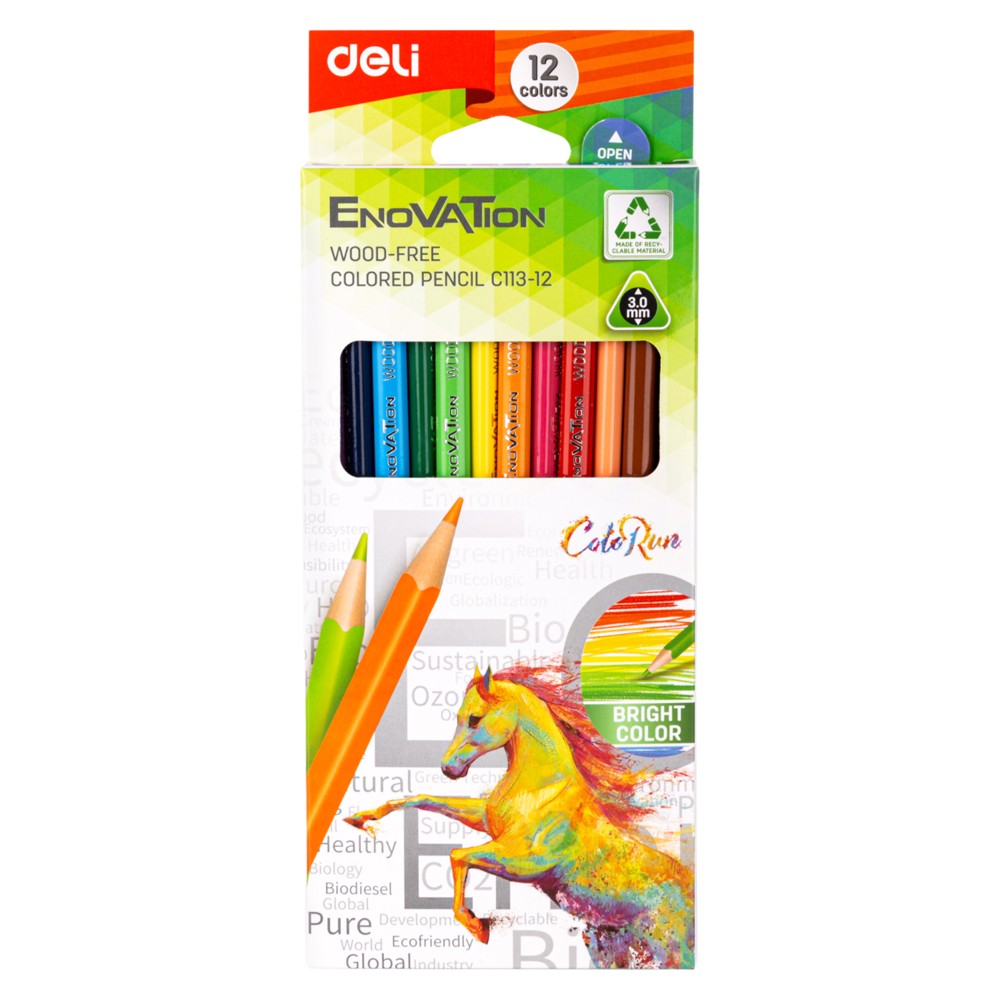 Bojëra druri Deli, Enovation, 12 ngjyra, druri. Ky set ofron një gamë të gjerë ngjyrash për vizatim dhe krijim artistik, ideal për fëmijët dhe artistët që kërkojnë ngjyra të pasura dhe të qëndrueshme.