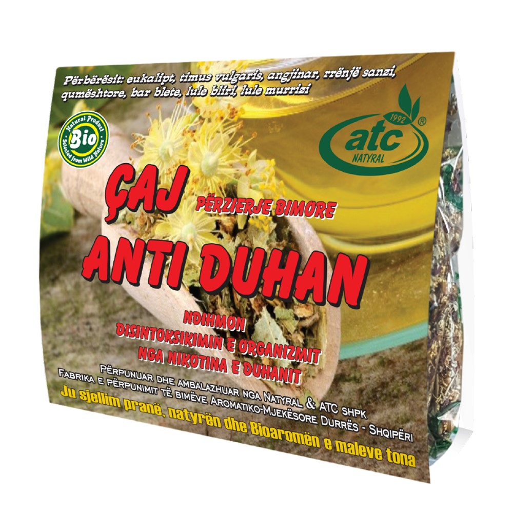 Çaj anti-duhan, me një përzierje bimësh mjekësore, e cila ndihmon për të lehtësuar dhe shëruar fillimisht simptomat specifike të krizës së mungesës së duhanit siç janë çrregullimet e metabolizmit, të tretjes, etj. Kjo përzierje përmban bimë mjekësore, që përfaqësojnë tre grupe të ndryshme principesh aktive dhe përfshijnë barin e bletës, murrizin, qumështoren, sanëzën, angjinaren, timusin, eukaliptin dhe blirin. Bari i bletës dhe murrizi veprojnë ndjeshëm kundër ankthit si dhe janë nxitës të fuqishëm të organizmit. Qumështorja, sanëza dhe angjinarja përmbajnë një bashkësi principesh akive që mbrojnë mëlçinë e zezë dhe veshkat, pasi ulin kolesterolin dhe shtojnë sekrecionet e tëmthit, gjë që i bën tretës të mirë dhe diuretikë. Timusi, ekualipti dhe lulja e blirit kanë rol balsamik dhe zbutës.