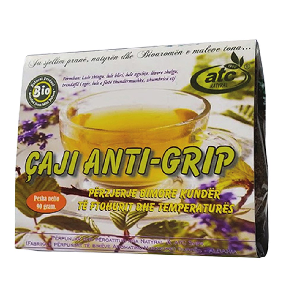 Çaj bimor, me efekt parandalues e qetësues të gripit, i cili vepron kundër temperaturës së lartë, me një përzierje bimësh që përmbajnë mucilagje, vajra eterike me aromë të këndshme, glukozitë, saponina, esenca të hidhura, vitamina etj. Lulja e aguliçes dhe thundërmushka veprojnë kundër gripit të rëndë dhe kollës së vazhdueshme. Lulja e blirit dhe zhumbrica, në sajë të esencës që kanë, ndihmojnë në mjekimin e rrugëve të acaruara të frymëmarrjes. Lulet e shtogut kanë veti zbutëse, ndihmojnë djersitjen dhe lirojnë spazmat e muskulaturës së butë. Lëvorja e shelgut, në sajë të salicinës që përmban, zbërthehet në organizëm duke liruar acidin salistik, si edhe është një ndikues i mirë në uljen e temperaturës së lartë. Trëndafili i kuq ka përmbajtje të lartë vitamine C dhe përdoret për fuqizimin e organizmit. Këto bimë rekomandohen si mjekues të mirë të të ftohurit dhe bllokimit të rrugëve të frymëmarrjes që shoqërohen me temperaturë.