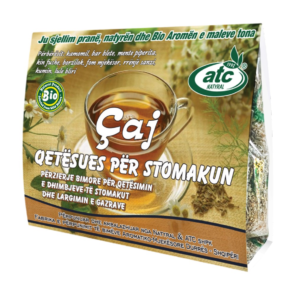 Çaj bimor për shëndetin e stomakut, i cili përmban kamomil, bar blete, mente, njëmijëfletësh, kinë fushe, borzilok, fom mjekësor, rrënjë sanëze, kumin dhe lule bliri. Kamomili, gjethja e mentes dhe bari i bletës përmbajnë esencë dhe substanca të tjera, të cilat veprojnë kundër gazeve të zorrëve dhe çrregullimeve të stomakut. Lulja e njëmijëfletëshit, në sajë të esencës dhe akileinës në përmbajtjen e saj, liron spazmat e muskulaturës dhe qetëson ngërçet e stomakut. Borziloku qetëson dhimbjet dhe është efikas kundër pezmatimit kronik të stomakut, si edhe çrregullimeve të sistemit tretës. Fomi mjekësor vepron në muskulaturën e lëmuar, duke përshpejtuar peristaltikën e zorrëve, ndihmon metabolizmin dhe përmirëson punën e stomakut. Bimët e këtij çaji kanë veti qetësuese duke ulur dhimbjet e stomakut dhe duke përmirësuar ndjeshëm funksionalitetin e tij. Rekomandohet të ruhet në vende të thata larg dritës dhe lagështisë.