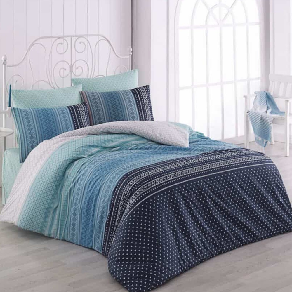 Set çarçafësh dopjo, i cili përfshin çarçafin e poshtëm, çarçafin e sipërm dhe 2 këllëfë jastëksh. Materiali cilësor hipoalergjik siguron komfort dhe freski gjatë përdorimit, duke e bërë gjumin më të rehatshëm. Dizajni unik me dy ngjyra bazë lejon kombinimin me lehtësi të setit në ambientet tuaja të brendshme, duke u dhënë dhomave të gjumit një pamje moderne dhe origjinale.