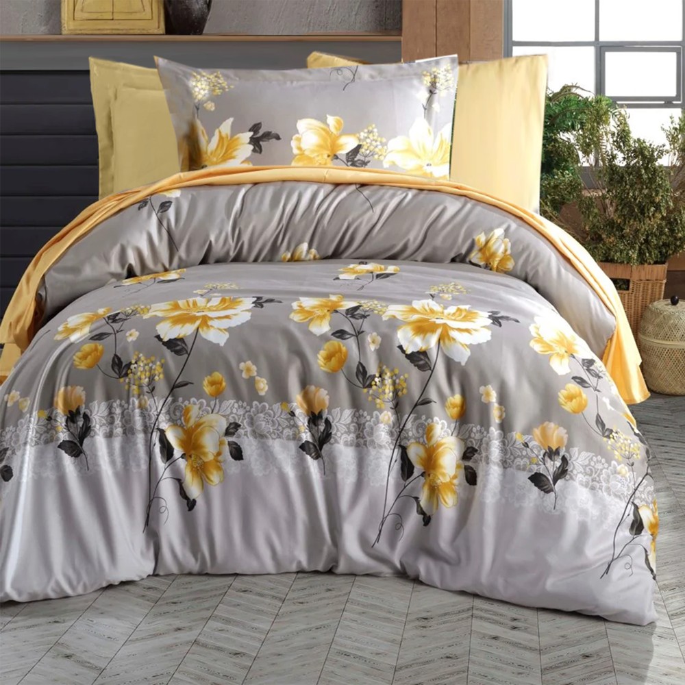 Çarçaf set, tek, fanellatë, gri me lule të verdha, 160x240 cm (x1); 90x190+ 25 cm (me llastik); (x1), 50x80 cm (x1)