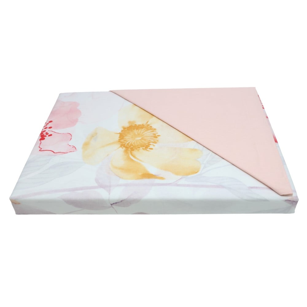 Çarçaf set, tek, pambuk, e bardhë me lule rozë, 165x240 cm; 90x190+ 25 cm; 50x80 cm (x1)