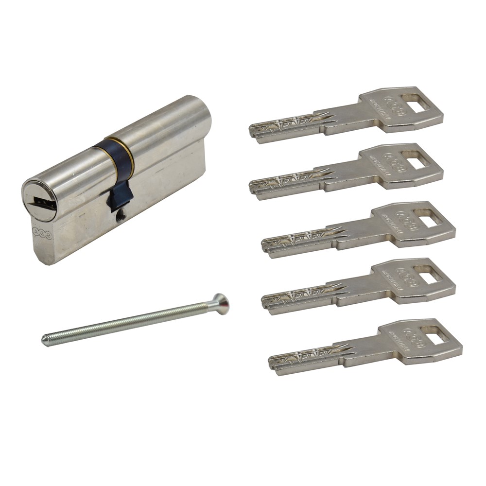 Cilinder per dyer te blinduara, me 5 celesa ,materiali bronz permasat 80mm. Ky cilinder perdoret kryesisht per dyert e jashtme ne saje te sigurise qe jep ky produkt dhe cilesise se larte ne materialin e perdorur. I prodhuar ne disa ndarje te segmentuara per ta bere te pa thyeshem si dhe te pa depertueshem me trapan .