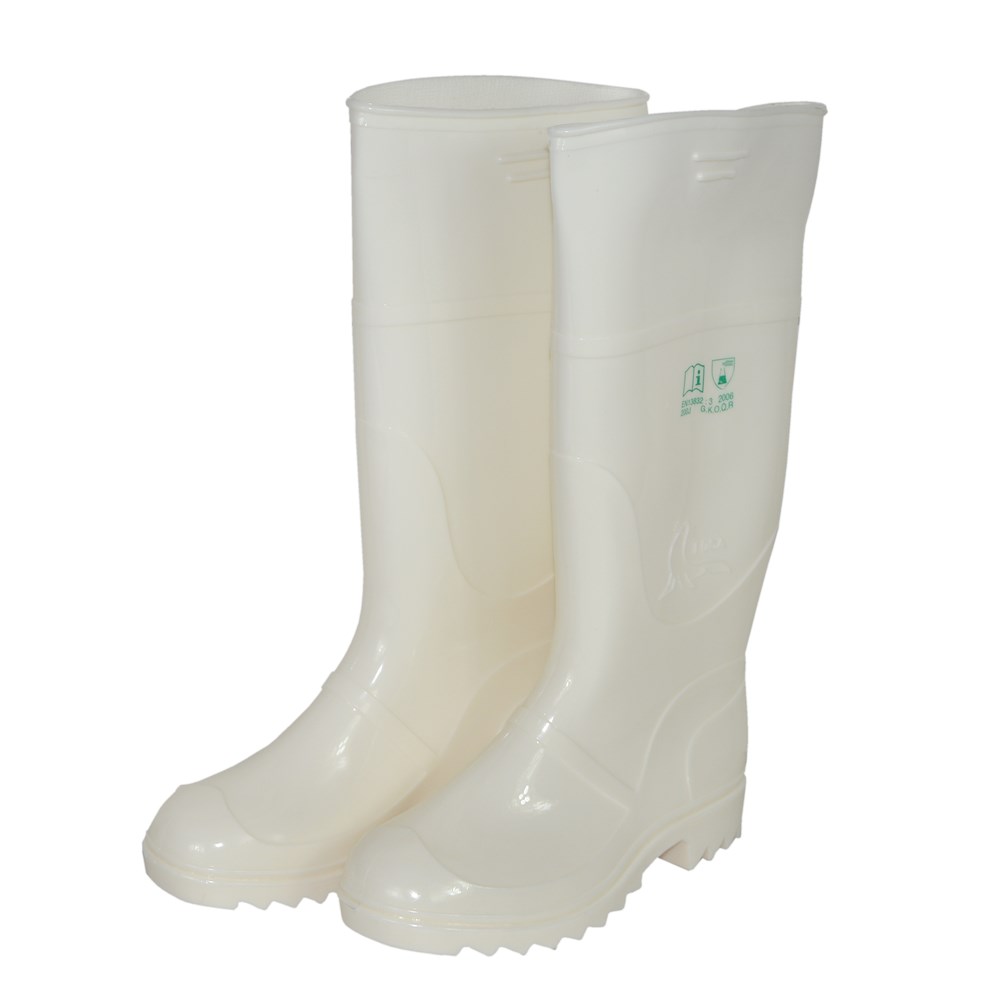Çizme plastike, të bardha për industrinë ushqimore. Materiali PVC dhe Nr.45. Prodhuar nga një material shumë cilësor dhe i virgjër prej PVC- je. Këto çizme mund të përdoren në vende me vajra, yndyrëra apo tretësira të tjera duke ju mbrojtur nga rrëshqitjet apo dëmtimet e mundshme në ambientet tuaja të punës.
