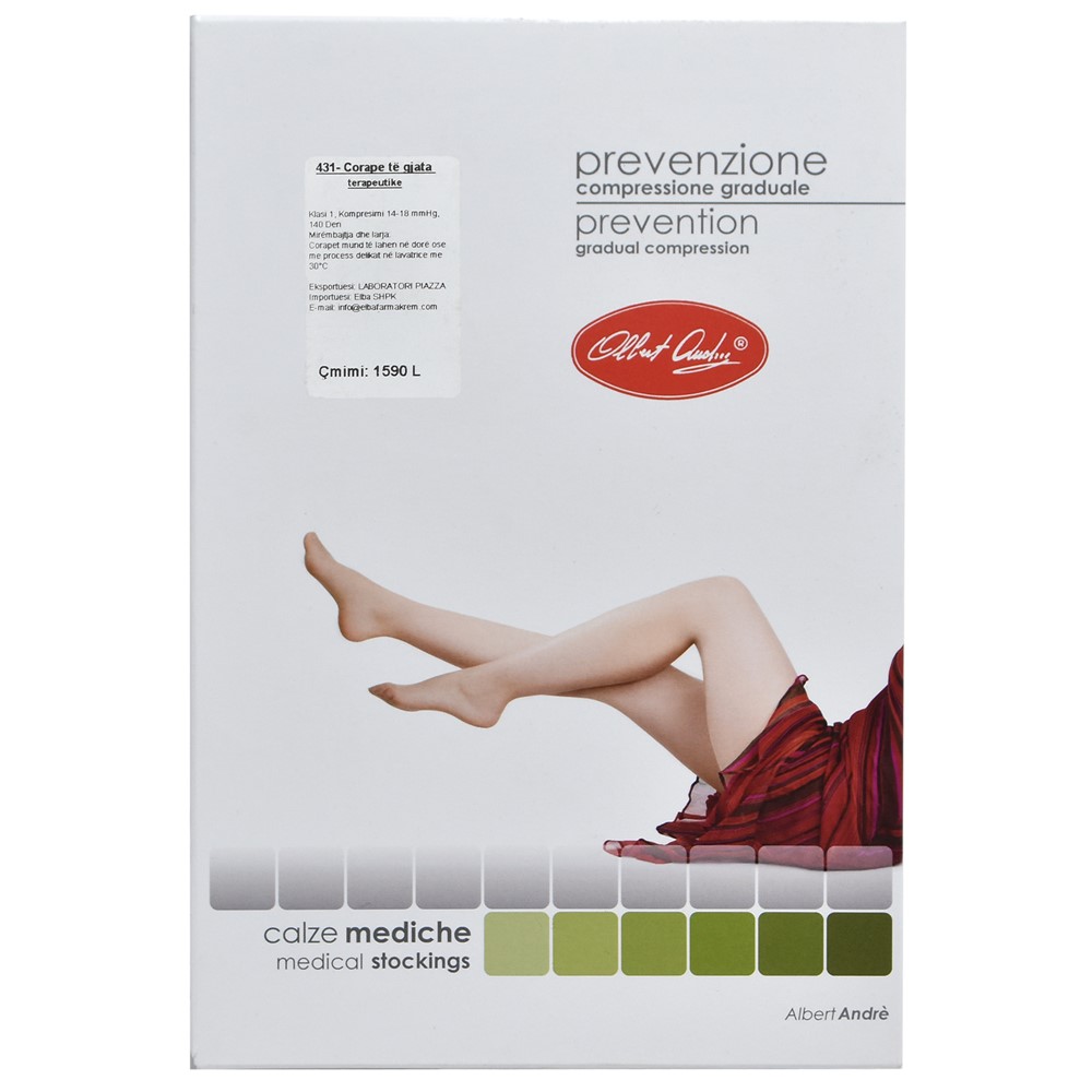 Çorape mjekësore kompresimi mbi gju, modeli 431, të përbëra prej materiali mikrofibër elastike, me një dendësi të thurjes prej 140 denier. Materiali përbërës është i butë, i bën çorapet të lehta për t'u veshur dhe lejon ajrosjen e këmbës. Mënyra e përdorimit: Çorapet e klasit 1 (20-30 mmHg) kanë një nivel të ulët kompresioni dhe janë të përshtatshme në përdorim: 1. për trajtimin e sindromës post-flebitike, 2. për trajtimin e insuficiencës venoze të lehtë, 3. për trajtimin e edemave të lehta (trauma, distorcione, shëmbje) të arteve inferiore, 4. si masë parandaluese para dhe post operatore tek pacientet me risk flebiti, 5. për trajtimin e flebitit, 6. si masë plotësuese kundrejt skleroterapisë, 7. për trajtimin e patologjive të tjera sipas rekomandimit të mjekut. Të mos përdoren në raste të: 1. ulçerave dhe plagëve, 2. simptomave të dermatitis, 3. djegieve, 4. simptomave të alergjisë ndaj materialeve që përbëjnë çorapet, 5. në të gjithë rastet, në të cilat mjeku nuk e sheh të arsyeshëm përdorimin e tyre. Mirëmbajtja dhe larja: Përdorimi dhe larja e shpeshtë nuk ndikojnë tek funksionaliteti i produktit. Çorapet mund të lahen me dorë ose me proces delikat në lavatriçe me 30°C. Çorapet duhet të thahen larg çdo burim nxehtësie (kalorifer, diell). Mos i thani çorapet tek makina tharëse e rrobave. Mos i hekurosni.