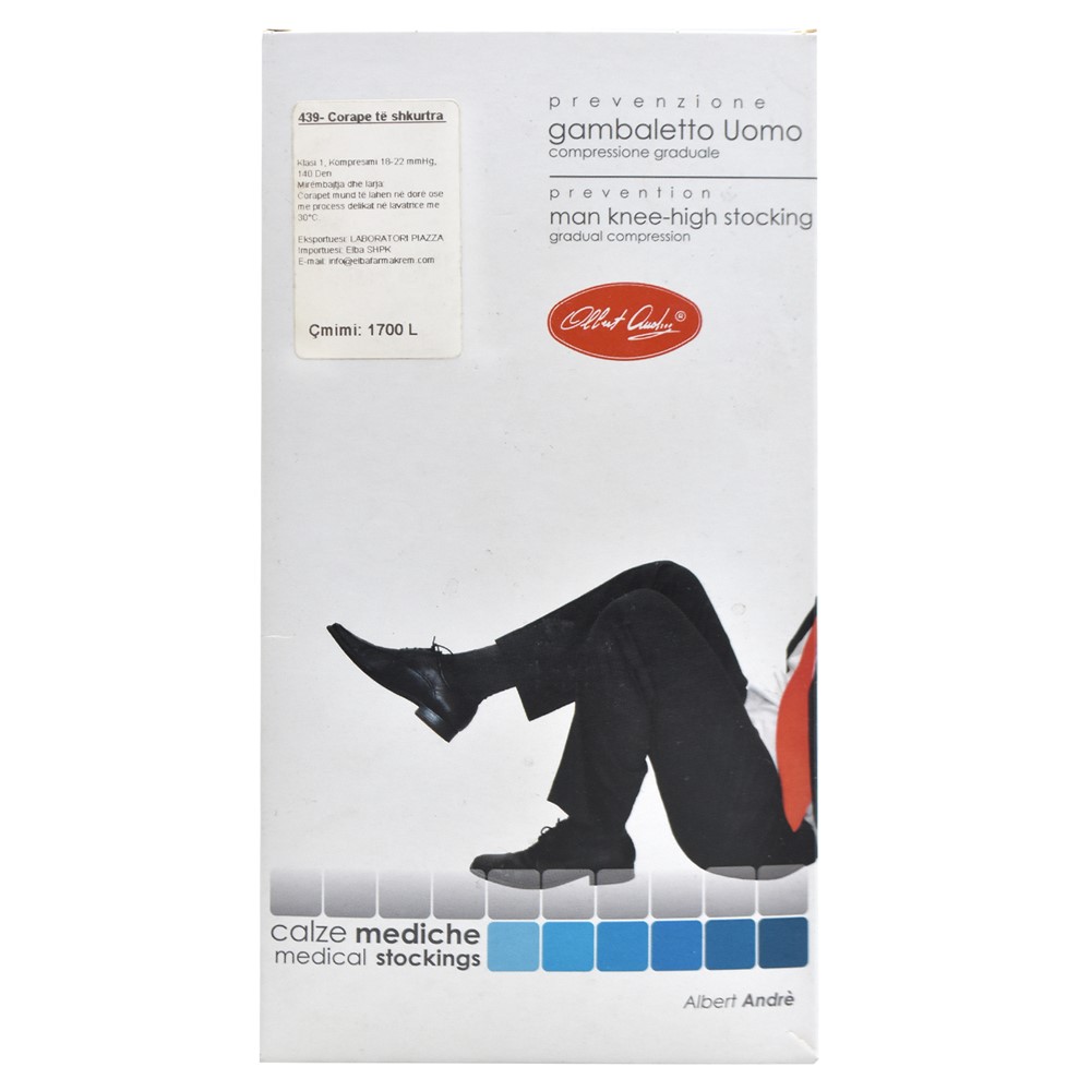 Çorape mjekësore kompresimi nën gju, për meshkuj, modeli 439, të përbëra prej materiali mikrofibër elastike, me një dendësi të thurjes prej 160 denier. Materiali përbërës është i butë, i bën çorapet të lehta për t'u veshur dhe lejon ajrosjen e këmbës. Mënyra e përdorimit: Çorapet e klasit 1 (parandaluese, 18-22 mmHg) kanë një nivel të ulët kompresioni dhe janë të përshtatshme në përdorim: 1. për trajtimin e sindromës post-flebitike, 2. për trajtimin e insuficiencës venoze të lehtë, 3. për trajtimin e edemave të lehta (trauma, distorcione, shëmbje) të arteve inferiore, 4. si masë parandaluese para dhe post operatore tek pacientet me risk flebiti, 5. për trajtimin e flebitit, 6. si masë plotësuese kundrejt skleroterapisë, 7. për trajtimin e patologjive të tjera sipas rekomandimit të mjekut. Të mos përdoren në raste të: 1. ulçerave dhe plagëve, 2. simptomave të dermatitis, 3. djegieve, 4. simptomave të alergjisë ndaj materialeve që përbëjnë çorapet, 5. në të gjithë rastet, në të cilat mjeku nuk e sheh të arsyeshëm përdorimin e tyre. Mirëmbajtja dhe larja: Përdorimi dhe larja e shpeshtë nuk ndikojnë tek funksionaliteti i produktit. Çorapet mund të lahen me dorë ose me proces delikat në lavatriçe me 30°C. Çorapet duhet të thahen larg çdo burim nxehtësie (kalorifer, diell). Mos i thani çorapet tek makina tharëse e rrobave. Mos i hekurosni.