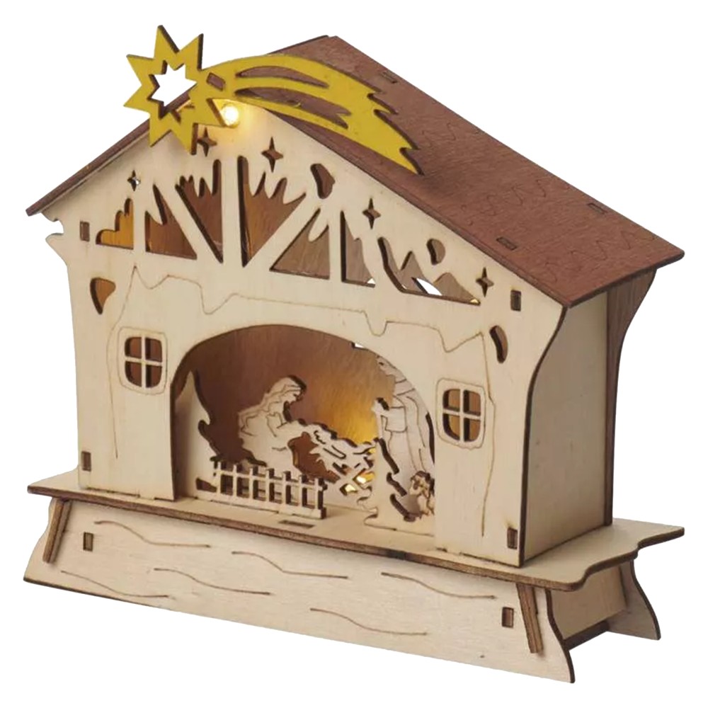 Dekor festiv Lindja e Krishtit, 4 led ndricim i ngrohte, me bateri 2xAA, 18x16.5 cm, dru natyral, perdorim i brendshem. Eshte periudha me e bukur e vitit. Bejini festat me te bukura me larmishmerine e artikujve tone.