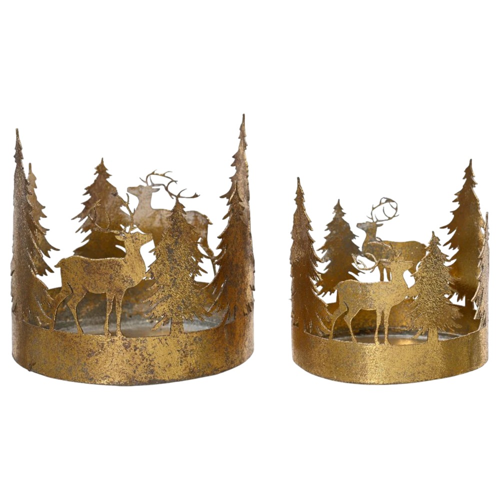 Sillni magjinë e natyrës në shtëpinë tuaj me këtë dekorues elegant dhe artistik. Të punuara me mjeshtëri me hekur dhe të lyer me ngjyrë floriri antike, ky dekorues paraqet një skenë pylli me drerë dhe pemë halore, duke krijuar një atmosferë të ngrohtë dhe festive. Të përsosura si mbajtëse qiriri apo thjesht si elementë dekorativë për tavolinë, këto objekte janë zgjedhje ideale për periudhën e dimrit, festat e fundvitit apo thjesht për dashamirësit e natyrës dhe stilit rustik.