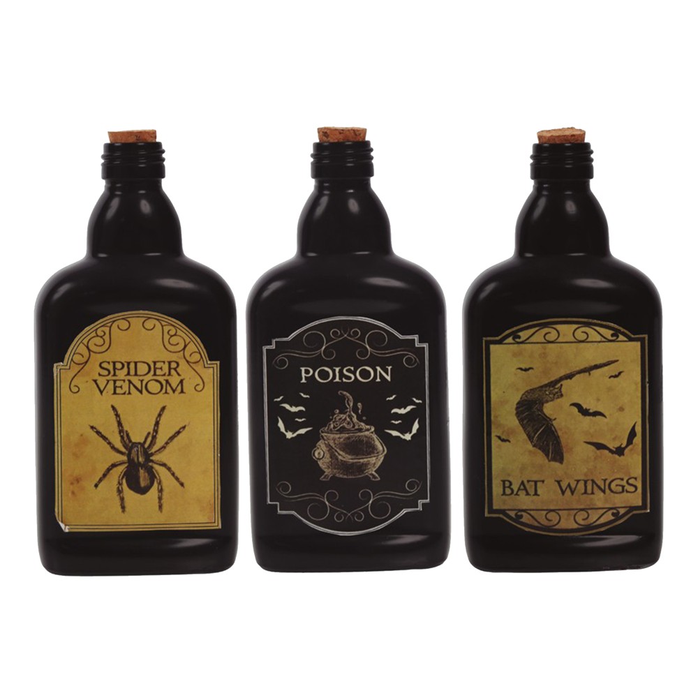 Shishe helmi të zeza 19 cm me tapë. Jane 3 modele të ndryshme: helm merimange, helm dhe krahë lakuriq nate. Një element thelbësor për dekorimin e tryezës suaj për Halloween.
