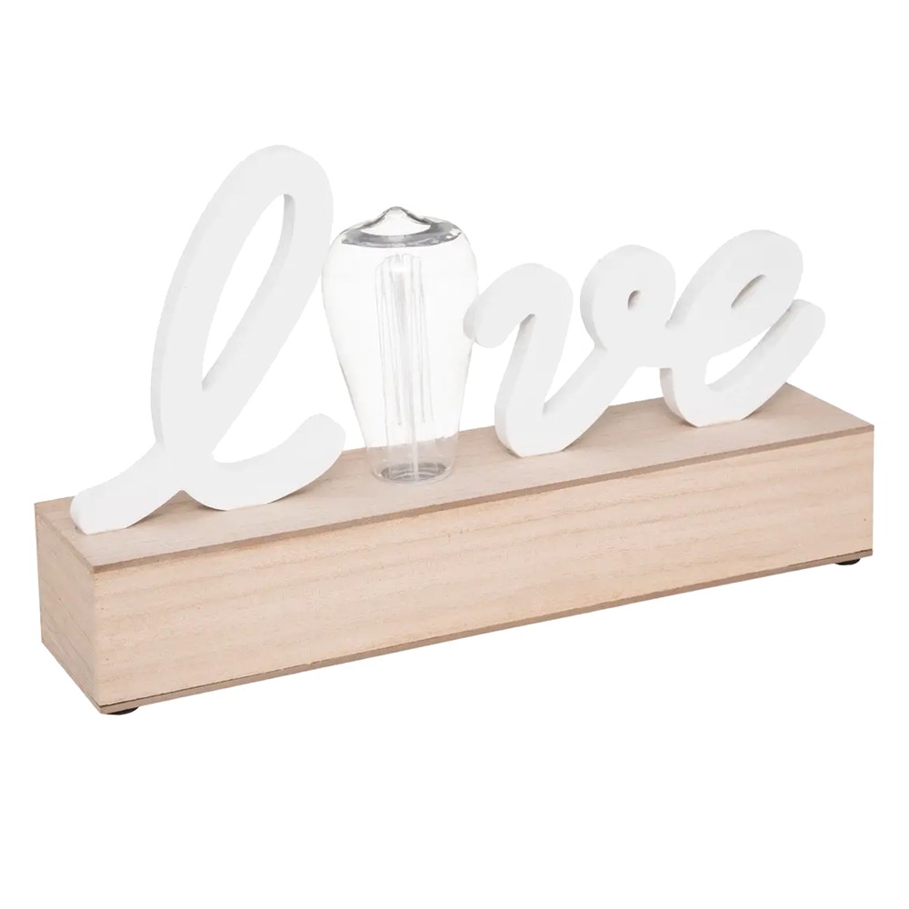 Dekorues tavoline Love, prej material mdf, në ngjyrë të bardhë dhe natyrale. Ka një përmasë prej 33.8x7.9x19 cm. Mund të përdoret si dekoruese në dhomë gjumi, apo ambiente të tjera të shtëpisë, pasi falë ngjyrave natyrale të saj, ajo shkon me cdo ambient.