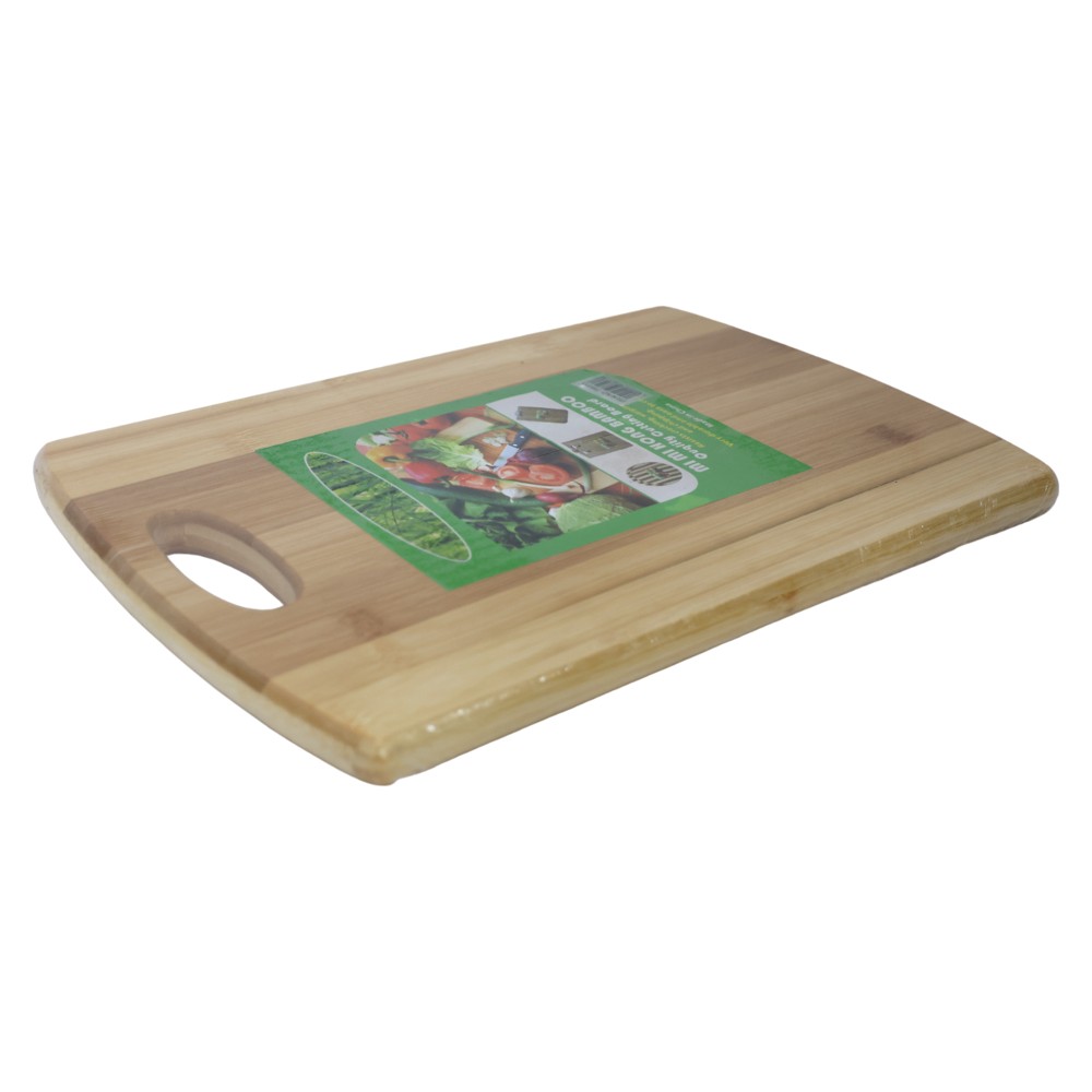Dërrasë prerëse nga bambu në ngjyrën kafe natyrale, me dimensionet 23x35 cm. Ky produkt ofron një sipërfaqe të mjaftueshme për prerjen e mishit, perimeve, apo frutave në kuzhinë.