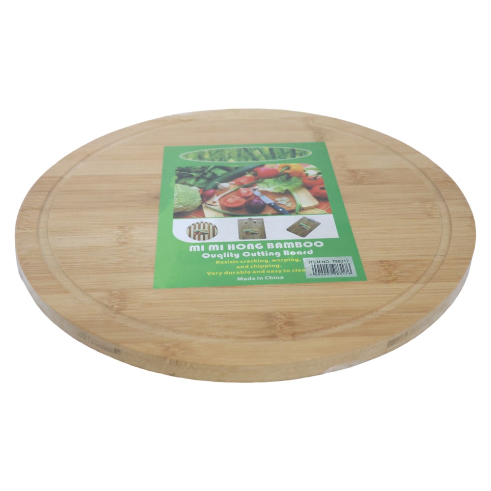 Dërrasë prerëse rrethore nga bambu në ngjyrën kafe natyrale, me diametrin 30 cm. Ky produkt ofron një zgjedhje elegante dhe funksionale për prerjen e mishit, perimeve, ose frutave.