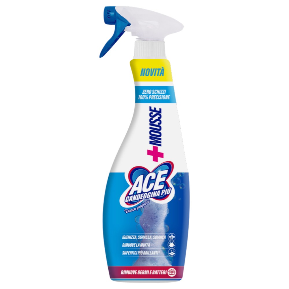 Pastrimi dhe higjienizimi i shtëpisë tuaj bëhet më i lehtë me ACE Candeggina Più Mousse Fresco Profumo. Formula e tij speciale pastron në thellësi, higjienizon dhe zbardh si sipërfaqet ashtu edhe rrobat e bardha. Falë strukturës në formë shkume, vepron më gjatë mbi sipërfaqe, duke hequr papastërtitë më të vështira, mykun dhe duke zbardhur fugat e pllakave. Ndihmon në eliminimin e mikrobeve dhe baktereve përmes veprimit mekanik, ndërsa neutralizon aromat e pakëndshme dhe i zëvendëson me një aromë të freskët dhe të këndshme, për një ambient gjithmonë të pastër dhe të higjienizuar.