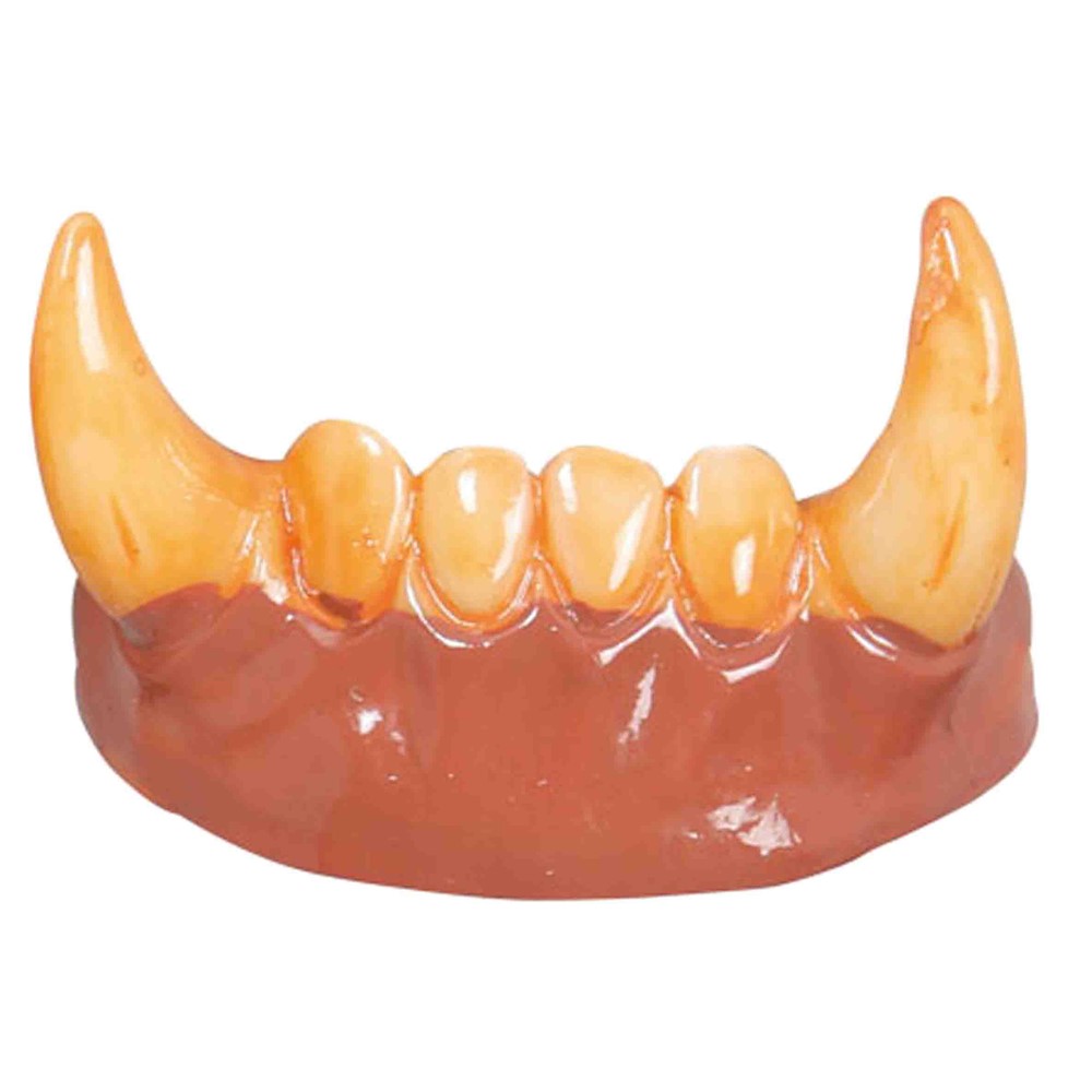 Dhëmbë Ujku, werewolf, në material plastik. Dhëmbët janë së bashku me mishrat e dhëmbëve të cilat vendosen në gojë duke krijuar efektin e Njeriut ujk.