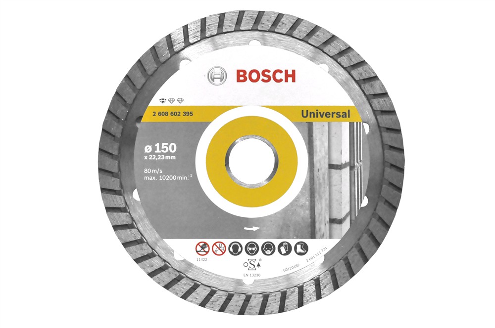 Disk diamanti profesional, 150x22.2 mm, universal. Përdoret për të prerë të gjitha llojet e materialeve të ndërtimit si: beton, tullë, pllakë, mermer etj. I ndërtuar me material çeliku dhe me dhëmbë diamanti siguron një prerje të shpejtë, të pastër dhe efikase. Disk me cilësi dhe jetëgjatësi të lartë.