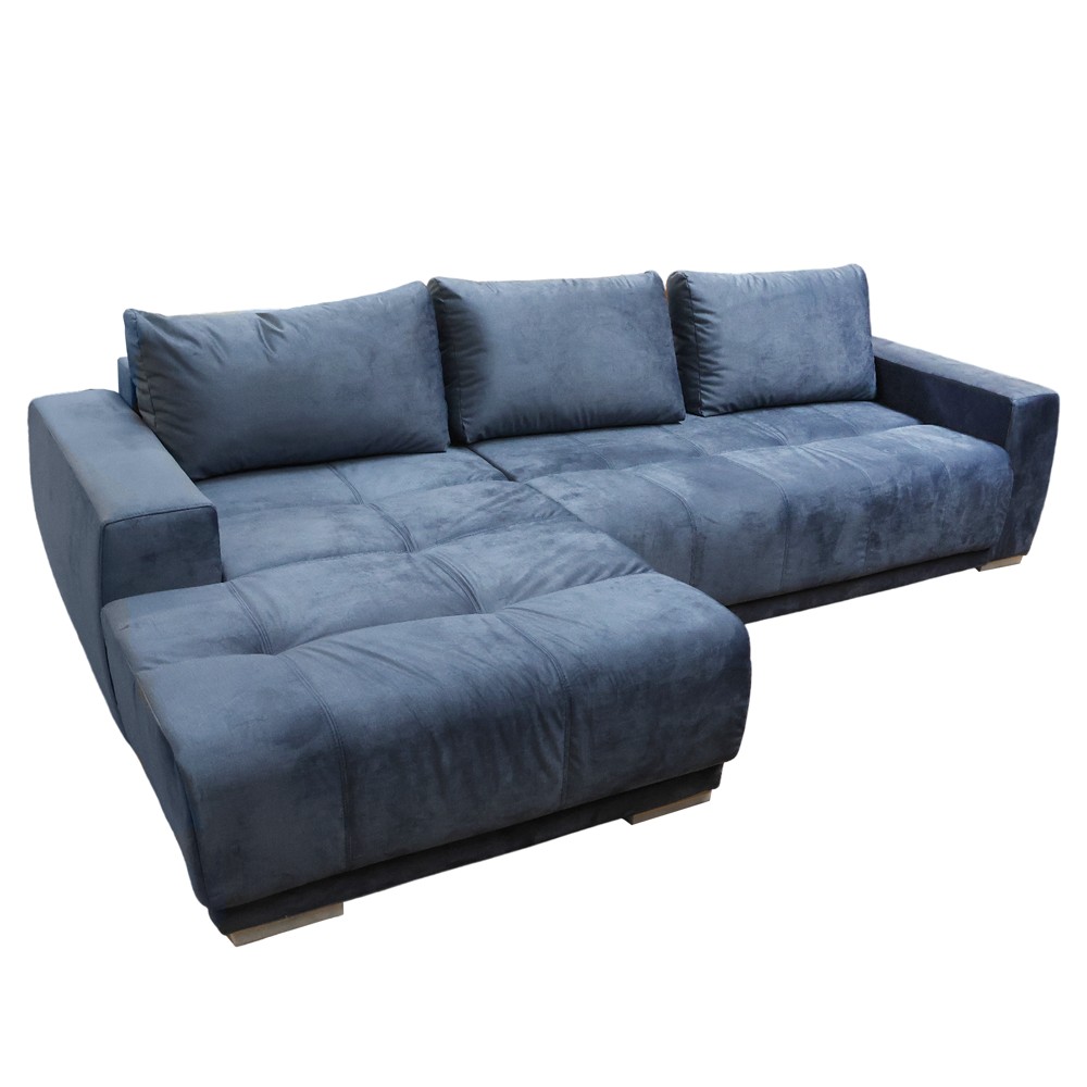 Divan këndor, me kanape në anën e majtë, me përmasa 280x204x66(87) cm, me tapiceri tekstili, në ngjyrë blu. Struktura mbajtëse është e përbërë nga shufra rezistente druri ahu dhe bredhi, si dhe material melamine, pa përmbajtje formaldehidesh. Mbushja e brendshme mesatarisht e butë përbëhet nga materiale sfungjeri, pa PVC, me susta çeliku përforcuese dhe këmbë statike kromi. Ndenjësja e divanit mund të hapet duke lejuar që të kthehet në një krevat, me sipërfaqe 230x130 cm. Materiali veshës është rezistent ndaj njollave dhe mund të pastrohet lehtësisht me një pecetë të lagur. Dizajni minimalist dhe funksional e bën këtë produkt një zgjedhje optimale për ambientet tuaja të brendshme.