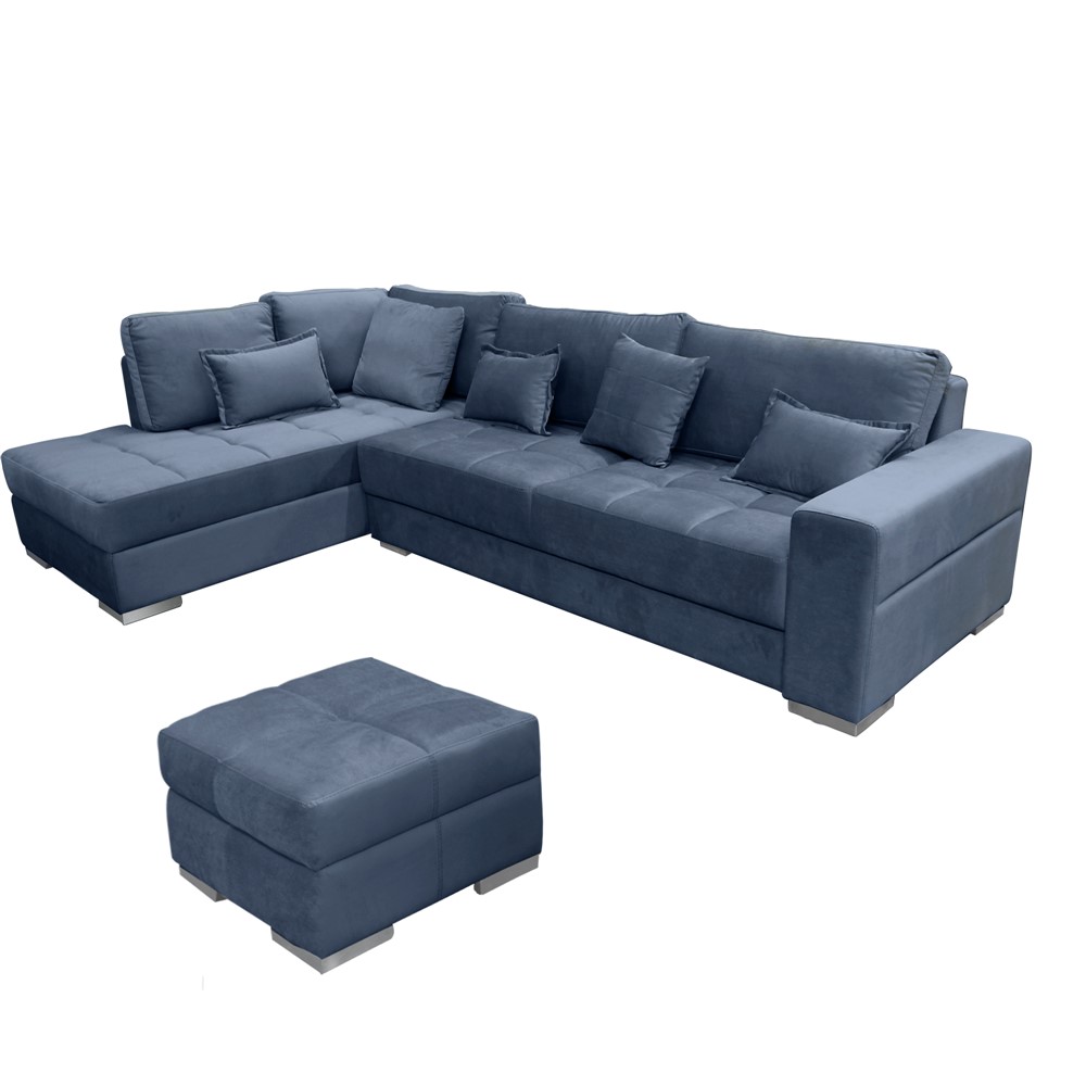 Divan këndor me pupë, mekanizëm hapje, majtas, DEA, strukturë druri/metalike, tapiceri tekstili, blu, divani këndor: 290x190xH70 cm; pupa: 68x68xH40 cm