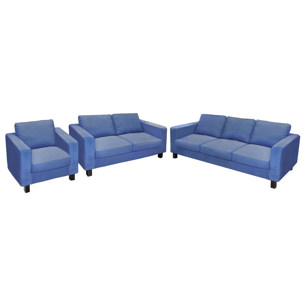 Divanë 3+2+1 vendësh, strukturë druri, tapiceri tekstili, blu, Divani 3-vendësh: 200x84xH80 cm; Divani 2-vendësh: 143x84xH80 cm; Kolltuku: 86x84xH80 cm