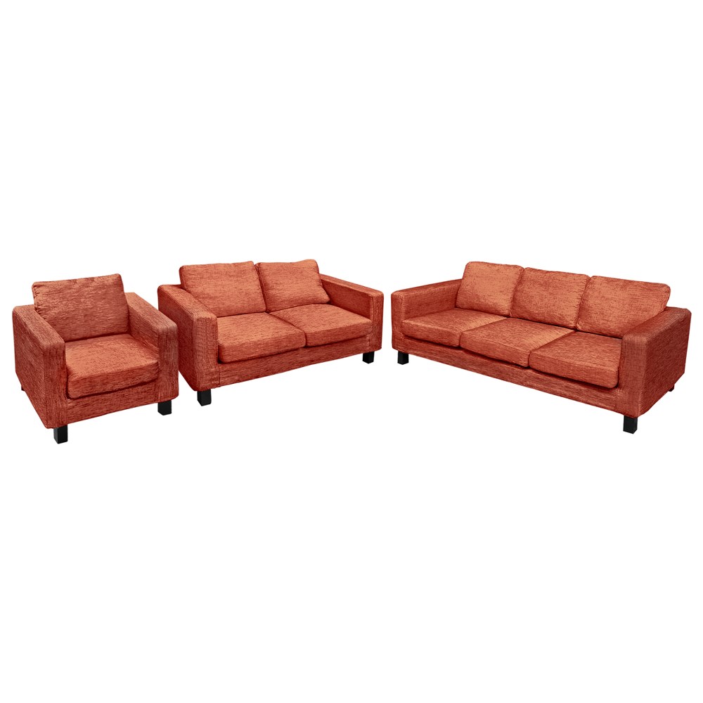 Divanë 3+2+1 vendësh, strukturë druri, tapiceri tekstili, portokalli, Divani 3-vendësh: 200x84xH80 cm; Divani 2-vendësh: 143x84xH80 cm; Kolltuku: 86x84xH80 cm