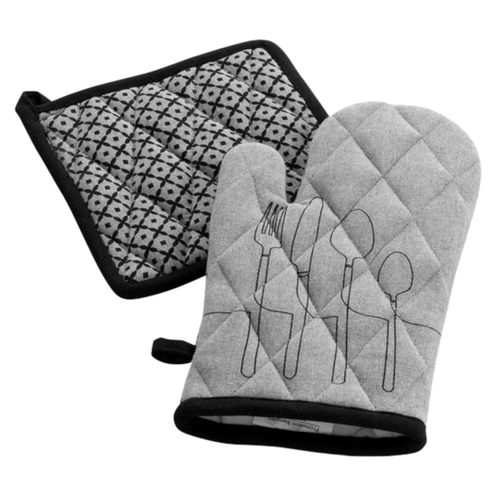 Doreza dhe mbajtësja e kuzhine është një aksesor i rëndësishëm për çdo ambient kuzhine. Këto janë aksesorë që shërbejnë për të kapur cdo enë kuzhine të nxehtë gatë gatimit. Produkti është i bërë nga pambuk i ricikluar. Me një kombinim të ngjyrave gri e hapur dhe e zeza, ata shfaqin një pamje elegante dhe të përshtatshme për çdo kuzhinë. Përmasat e tyre të përshtatshme, 18x28 cm doreza dhe 20x20 cm mbajtësja. Doreza dhe peceta janë jo vetëm funksionale, por edhe estetike, duke shtuar një prekje të bukur dhe të dobishme për ambientin tuaj të gatimit.