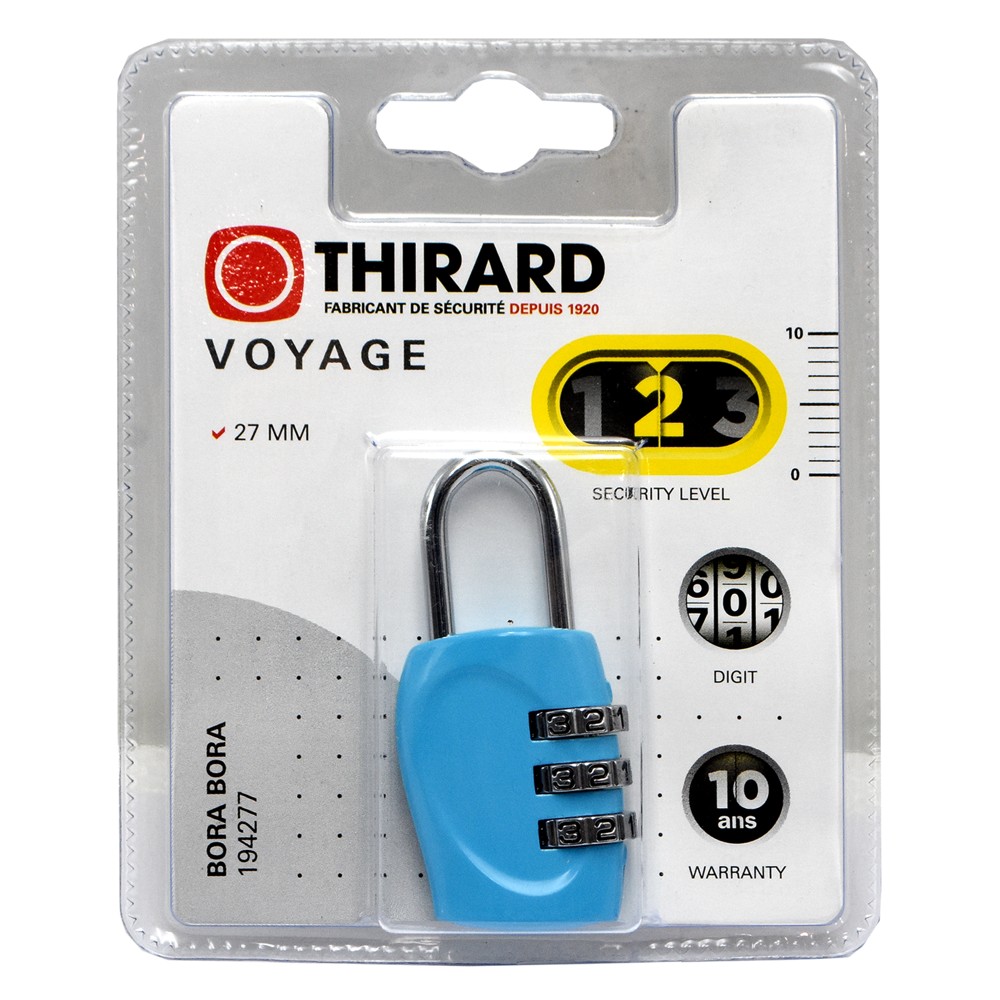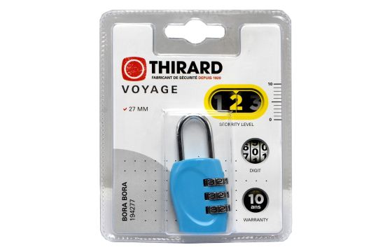 Moulded Alloy body. Nickel plated steel shackle. It has a 3-number mechanism and a resettable combination.