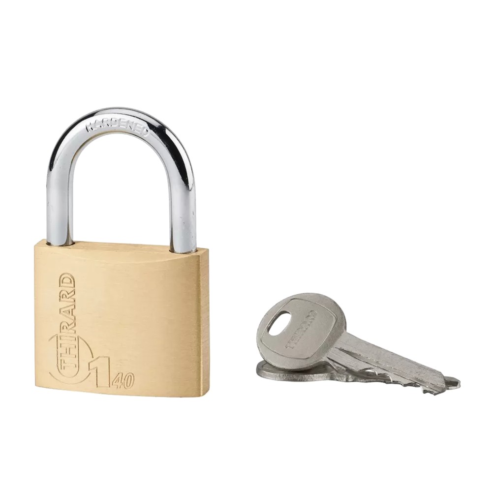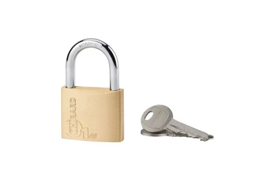 Padlock 40 mm consisting of compact alloy body with nickel-plated steel bow. Simple locking pin mechanism. There are 2 nickel plated steel keys.