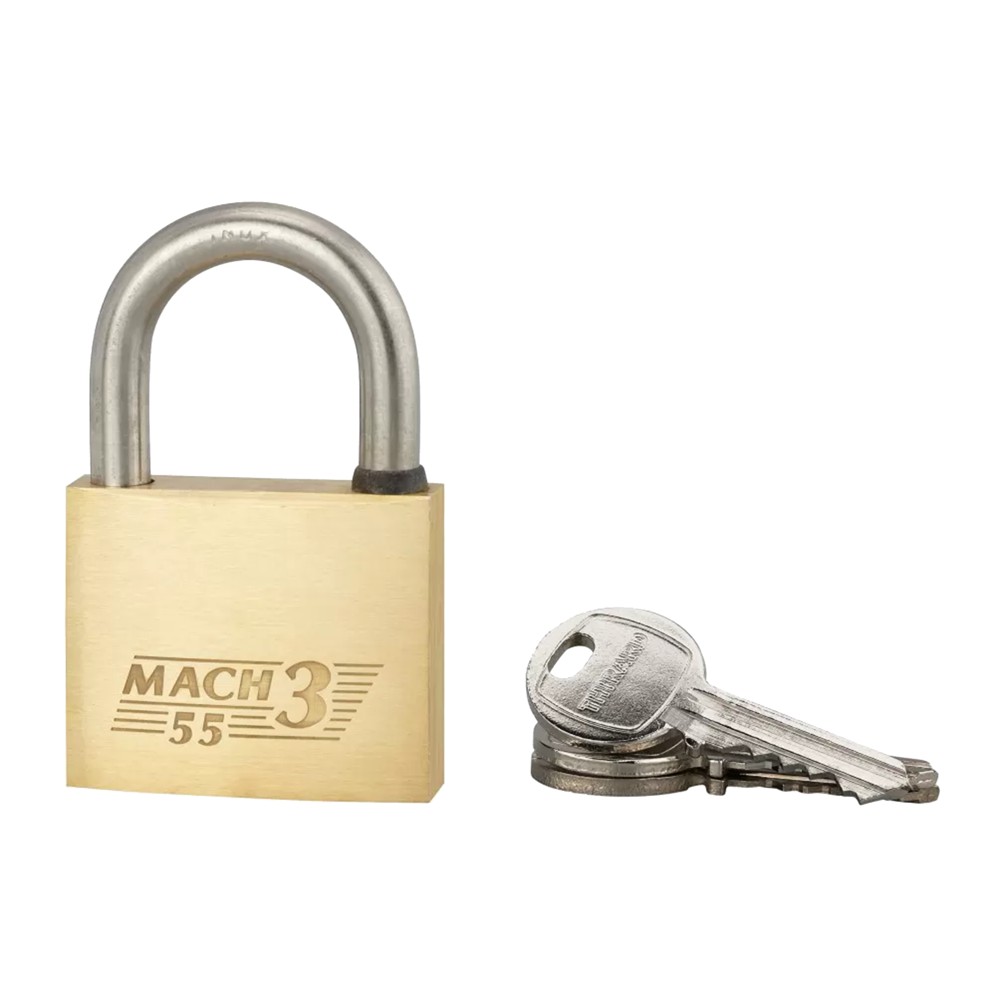 Compact brass body. Stainless steel shackle. Pin mechanism. Double bolt locking. Shackle grommet. Flow through water hole. 2 nickel plated steel keys.