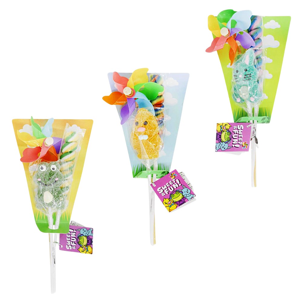 Embelsire e veshur me sheqer me aromë frutash. Përbërësit: shurup glukoze, sheqer, ujë, agjent xhelatinoz (E440), aromatizues, niseshte misri e modifikuar, xhelatinë viçi, ngjyrues (E141, E160a, E100, E120, E133). Çamçakëz me aromë frutash. Përbërësit: sheqer, shurup glukoze, rregullues aciditeti (E330), aromatizues, ngjyrues (E141, E160a, E100, E120, E133).