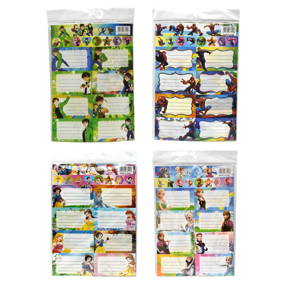 Etiketa libri me figura, prej materiali letre cilësore, në ngjyra dhe dizajne të ndryshme. Përdoren nga fëmijët për t'u vendosur në kapakët e librave dhe fletoreve, për të shënuar emrin.
