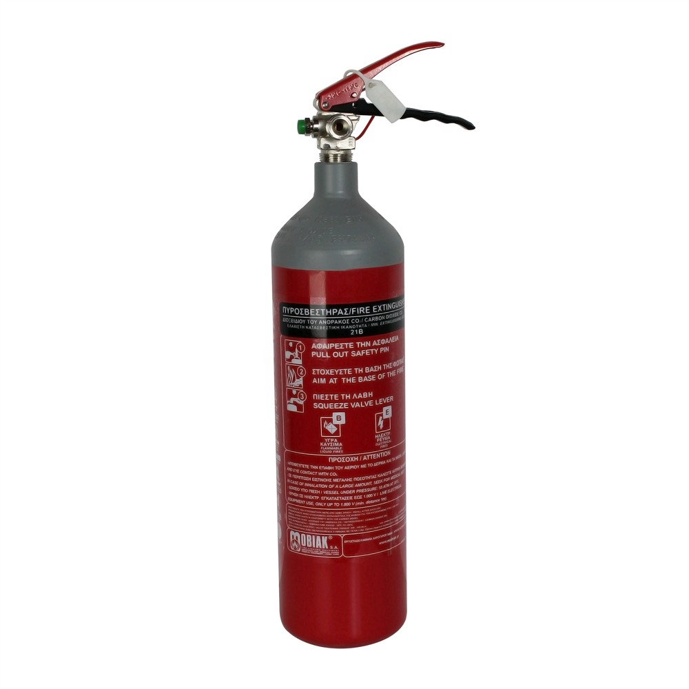 Fikese zjarri me dioksid karboni 2kg, perdoret per te fikur dhe parandaluar zjarrin I cili mund kete perfshire E- aparatura elektrike dhe F- vajrave dhe yndyrnave. Fikja realizohet duke hedhur dioksidin e karbonit rrotull vatres se zjarrit me qellim parandalimin dhe eleminimin e zjarrit, gjithashtu dioksidi i karbonit ndihmon ne uljen e temperatures. Bombula eshte e ndertuar nga celik special sipas standarteve europiane