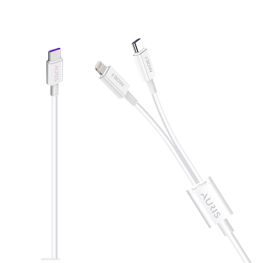 Fishë karikimi 2 në 1, Auris, CB56, Type-C, Lightning, 30 W, 100 cm, ngjyrë e bardhë