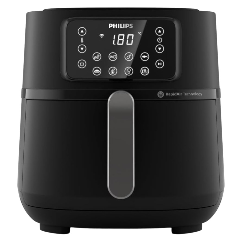 Fritezë me ajër Philips është një pajisje gatimi e fuqishme dhe e gjithanshme me deri në 16 funksione gatimi falë qarkullimit superior të nxehtësisë së Teknologjisë RapidAir+ për pjata të shijshme dhe të gatuara në mënyrë të barabartë. Aplikacioni intuitiv HomeID lidhet pa probleme me Airfryer-in tuaj, duke e bërë atë një shoqërues të domosdoshëm gjatë vakteve. Mund të shkoni përtej skuqjes së shëndetshme dhe të zbuloni receta të reja interesante dhe të shijshme, dhe madje të monitoroni gatimin tuaj nga distanca nga aplikacioni. Philips Airfryer 5000 Series XXL Connected i ri ka 16 funksione të ndryshme gatimi: skuqje, pjekje, pjekje në skarë, pjekje në furrë, dehidratim, thekim i thekur, shkrirje, ngrohje përsëri, fermentim dhe shumë më tepër. Zgjidhni një recetë, dërgojeni në Airfryer dhe monitoroni progresin e gatimit tuaj nga komoditeti i divanit tuaj. Aplikacioni HomeID ju udhëzon në çdo hap të procesit në mënyrë që të mund të përgatisni vakte shtëpiake që ju dhe familja juaj i doni, çdo ditë. Kontrolli zanor është gjithashtu i aktivizuar dhe i pajtueshëm me Amazon Alexa. Philips Airfryer 5000 Series XXL Connected është projektuar duke pasur parasysh familjen tuaj. Shporta me kapacitet 1.4 kg, e kombinuar me tiganin 7.2 litra, ju ndihmon të gatuani një shumëllojshmëri vaktesh. Përgatitni deri në 6 porcione vaktesh në të njëjtën kohë për familjen dhe miqtë tuaj.