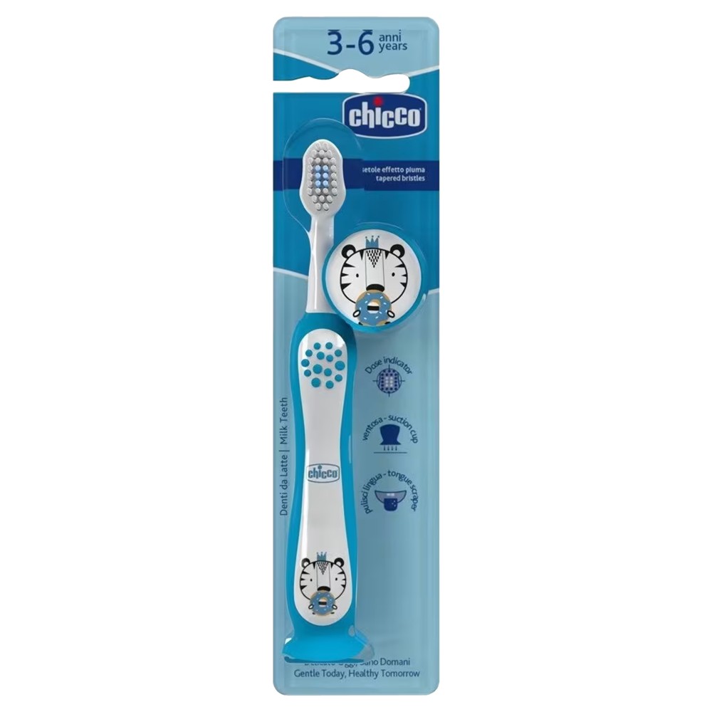 Furçë dhëmbësh e përshtatshme për fëmijë të moshës 3 deri në 6 vjeç, e krijuar posaçërisht për kujdesin e dhëmbëve të qumështit. Linja e re Chicco Oral Care Extra Delicate respekton në mënyrën më të mirë mishrat delikatë të fëmijëve dhe smaltin e dhëmbëve të tyre. Higjiena e përditshme dentare është një zakon i mirë që mësohet që në moshë të hershme, edhe para daljes së dhëmbëve të parë. Ajo ndihmon në parandalimin e shumimit të baktereve dhe në formimin e zakoneve të shëndetshme që zgjasin gjithë jetën.