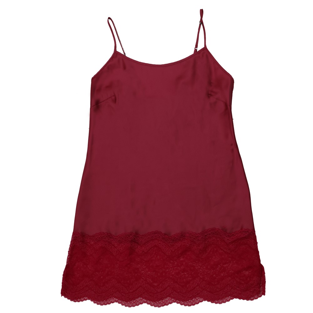 Fustan me rripa per gjume, prej materiali saten ne ngjyre te kuqe, ne pjesen fundore ka nje tantelle e cila e ben ate me te vecante.