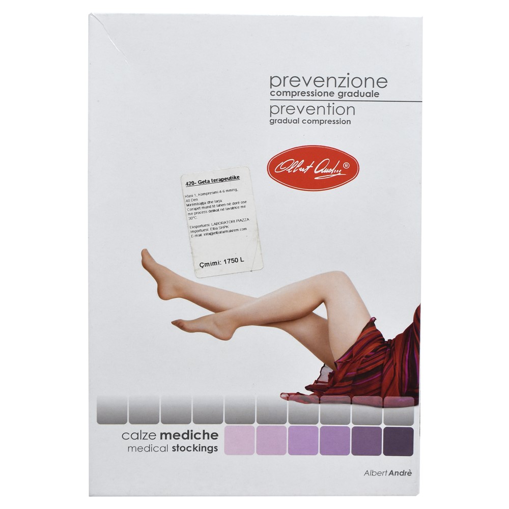 Geta mjekësore kompresimi për femra, modeli 420, të përbëra prej materiali mikrofibër elastike, me një dendësi të thurjes prej 40 denier. Materiali përbërës është i butë, i bën getat të lehta për t'u veshur dhe lejon ajrosjen e këmbës. Mënyra e përdorimit: Getat për përdorim të përditshëm, me efekt parandalues (4-6 mmHg) kanë një nivel të ulët kompresioni dhe janë të përshtatshme në përdorim: 1. për trajtimin e sindromës post-flebitike, 2. për trajtimin e insuficiencës venoze të lehtë, 3. për trajtimin e edemave të lehta (trauma, distorcione, shëmbje) të arteve inferiore, 4. si masë parandaluese para dhe post operatore tek pacientet me risk flebiti, 5. për trajtimin e flebitit, 6. si masë plotësuese kundrejt skleroterapisë, 7. për trajtimin e patologjive të tjera sipas rekomandimit të mjekut. Të mos përdoren në raste të: 1. ulçerave dhe plagëve, 2. simptomave të dermatitis, 3. djegieve, 4. simptomave të alergjisë ndaj materialeve që përbëjnë çorapet, 5. në të gjithë rastet, në të cilat mjeku nuk e sheh të arsyeshëm përdorimin e tyre. Mirëmbajtja dhe larja: Përdorimi dhe larja e shpeshtë nuk ndikojnë tek funksionaliteti i produktit. Çorapet mund të lahen me dorë ose me proces delikat në lavatriçe me 30°C. Çorapet duhet të thahen larg çdo burim nxehtësie (kalorifer, diell). Mos i thani çorapet tek makina tharëse e rrobave. Mos i hekurosni.